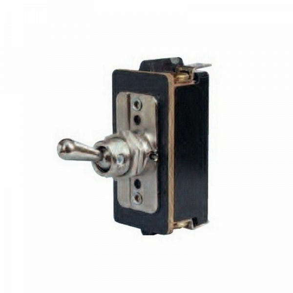 On/off, double pole heavy duty switch with nickel plated brass lever and 6.3mm blade terminals. 13mm panel hole. 20 amps at 12 volt dc rating.